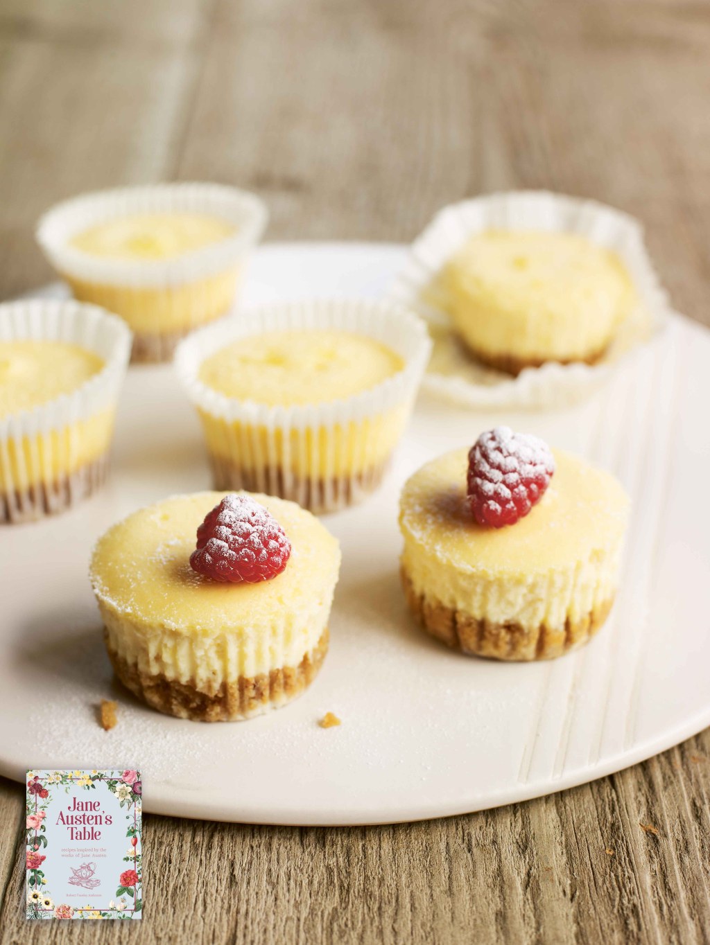 - 4. Remove the cheesecakes from the cases and place on a serving plate. Serve warm, decorated with raspberries and a dusting of icing sugar.