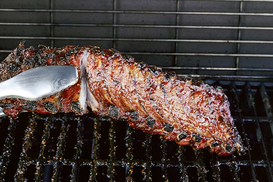 Brush the racks lightly on both sides with the glaze. Turn them bone side up and continue cooking over roasting/indirect very low heat, with the lid closed, for 30 minutes. Continue to brush the racks with the glaze on both sides and to turn them every 30 minutes, rotating the position of the racks occasionally, until fully cooked. The total cooking time will be 2½–3½ hours.