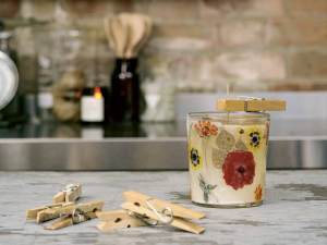 - Place your wicked jars at even intervals on a tray or on a work surface covered with greaseproof paper. Push the wick away from the direction of the pour to the side of the vessel. Make sure you’re extra careful when it comes to pouring and take care when it comes to the temperature. You don’t want to work with wax that’s too hot as it might cause the petals, leaves and blossoms to come off straight away.
