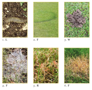 Can you figure out what problem, pest or disease is making a mess of the l awn in each picture below? We’ve given you the first letters.