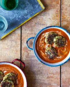 Once it’s cool enough, blitz the mixture in a blender, then return it to the same pan. Add the water, salt, sugar and all the spices. Cover and cook for 5 minutes. To make the koftas, grate the courgettes and squeeze out the excess liquid. Put them into a bowl with the gram flour, salt, chilli powder and amchoor and mix well – the mixture will bind itself as you stir.