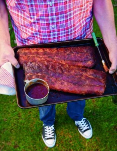into the meat. Just before serving, lightly brush with another layer of sauce. Cut the racks into individual ribs and serve warm.