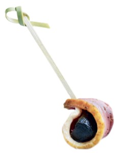 Everyone loves food on sticks, wrapped in bacon or not. Frankly, I think half the fun of planning a party is the chance to create some new combinations and serve some old classics (honey-glazed sausage, anyone?). Here are a few of my current favourite things on sticks. They are fairly free-form – each idea is for one stick – just make as many as you need.